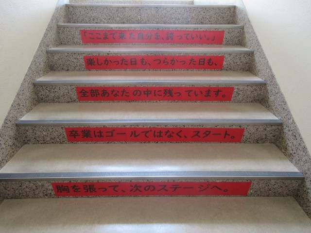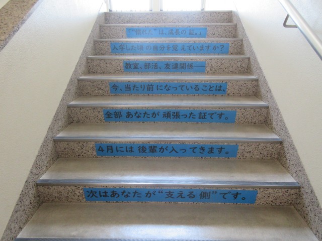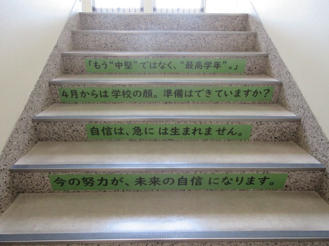 3月に入りました。いよいよ今年度最後の月です。階段には、それぞれの学年のみなさんに向けてのメッセージが貼られています。このメッセージを自分自身で1度受けとめてください。そして、今月も活力あるスタートを切ってほしいと思います。