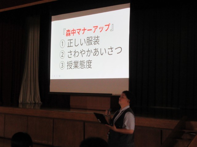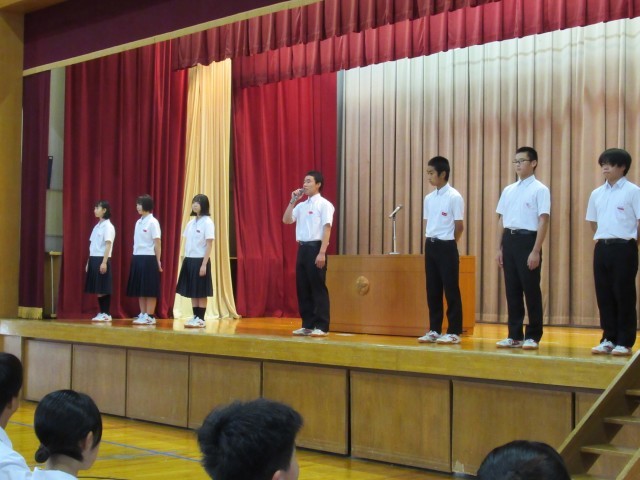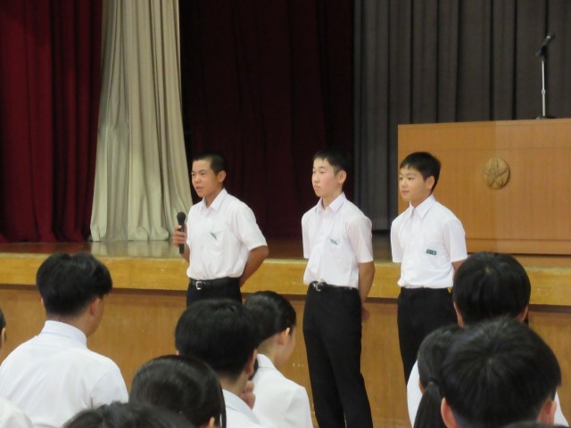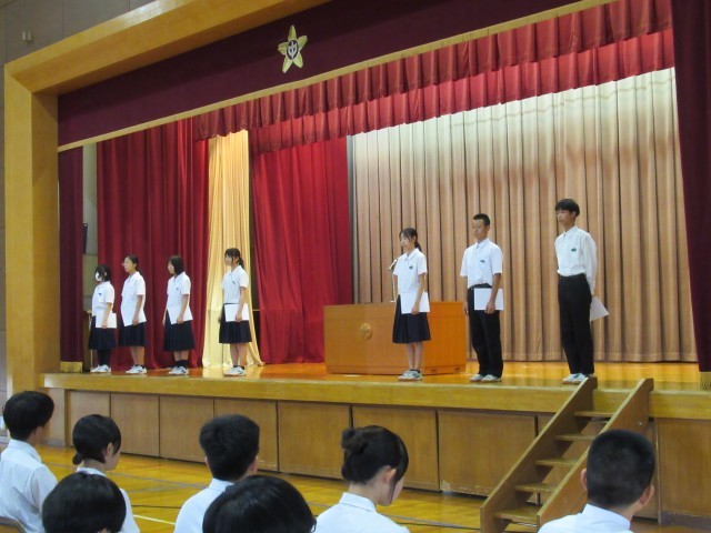 本日10月1日(水)は1限目に前期生徒会役員の解任式と後期生徒会役員の認証式を行い、続けて全校集会と表彰披露を行いました。