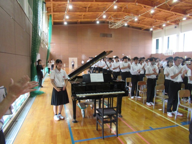 合唱コンクールで、指揮者と伴奏者をする人が集まって、学習会が行われました。入退場の仕方、礼の仕方、タイミングの合わせ方、強弱のつけ方、とめ方などについて話がありました。どの人も真剣に話を聞いていて、教えてもらったことを自分のものにしようする積極的な姿がたくさん見られました。合唱コンクールまであと20日。少しずつ磨きをかけ、当日をむかえてほしいと思います。