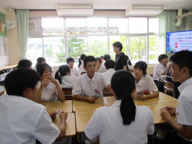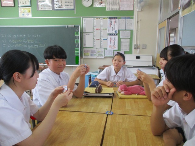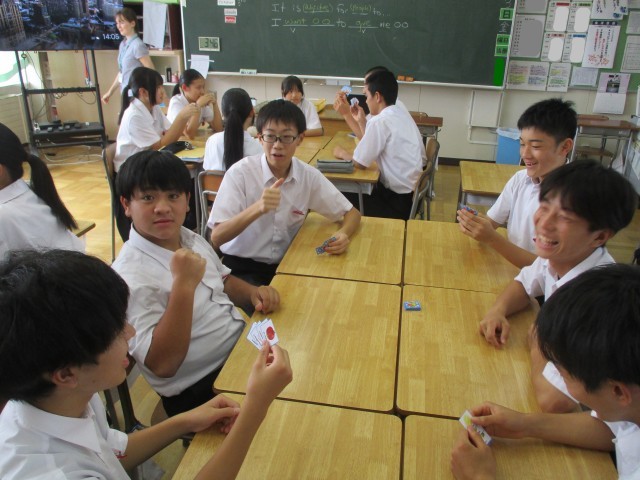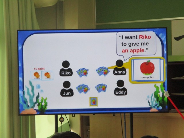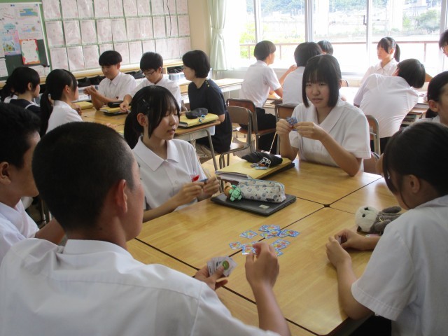 6人グループで行っています。各々が4枚のカードを持ったらスタートです。自分の手持ちのカードと他の人が持っているペアリングさせたらポイントゲット!うまくペアリングできなかったら、Go For It!と言われて、まん中の山からカードをとっていきます。最初は、適当なカードから、相手にもっているかを尋ねなければなりませんが、徐々に進んでいくと、相手がどんなカードを持っているかが分かってくる・・・?英語を使って、ちゃんとやりとりができました。