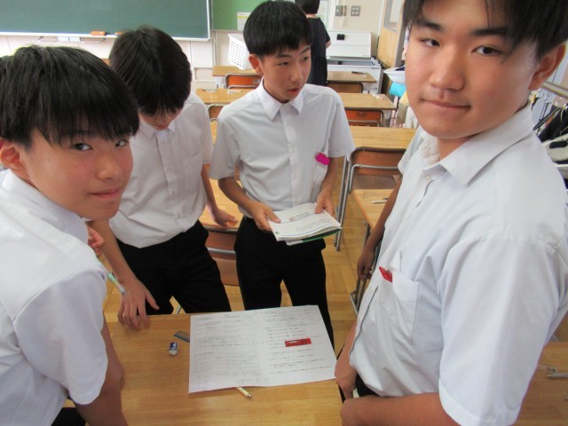 総合的な学習の時間に行っている「デジタル探究学習」の相互評価をしています。他の班の探究学習のシートを見て、自分たちの探究学習に参考になることがあったのではないでしょうか。文化祭当日の発表に向けて、さらに学習を進めてほしいと思います。