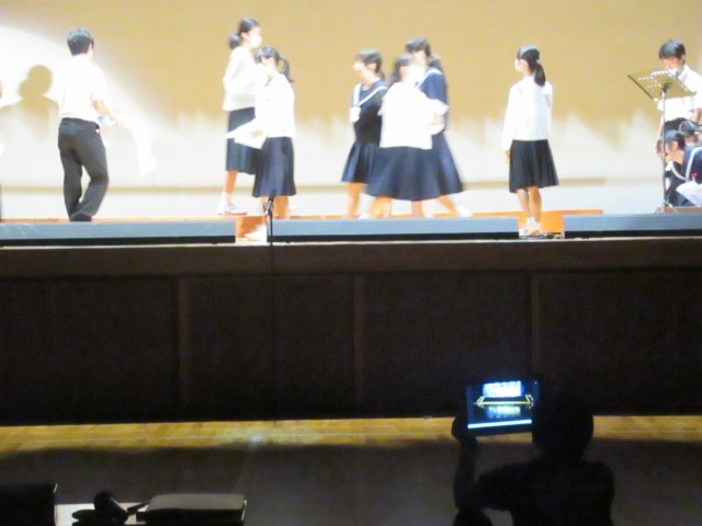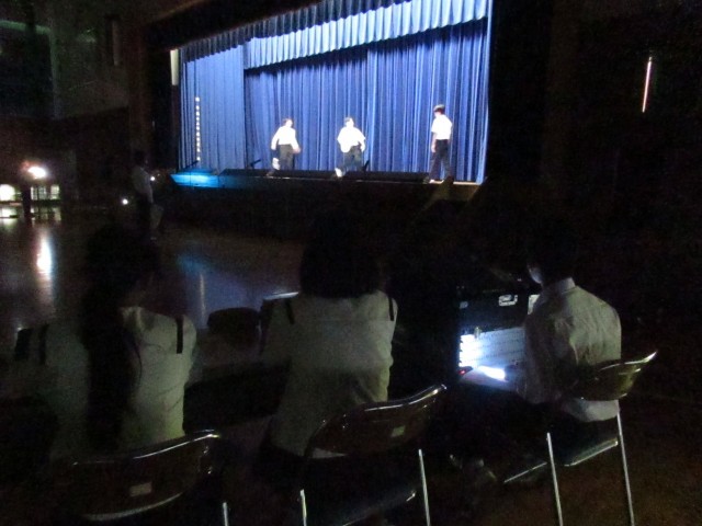舞台練習の様子をタブレット端末で撮影して、演技等の振り返りをします。教室にはモニターがありますから、全員で改善点を話し合うことができるからいっそうの上達につながっています。