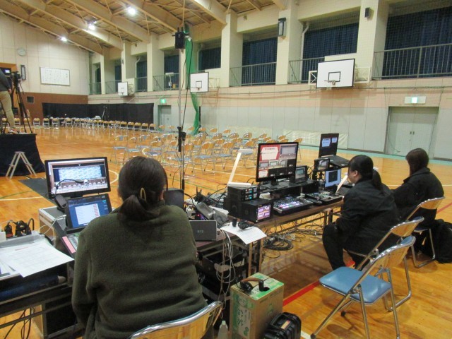 令和7年10月29日(水) 公開日 2025/10/29 更新日 2025/10/29 学校日記 配信用の機材とスタッフの皆さんです。モニターがいっぱいあります。開会は8:40なので、5分くらい前から配信開始です。※ライブ映像閲覧には、配信アドレスとパスワードが必要になります。