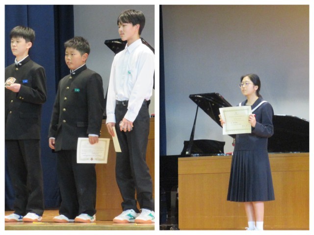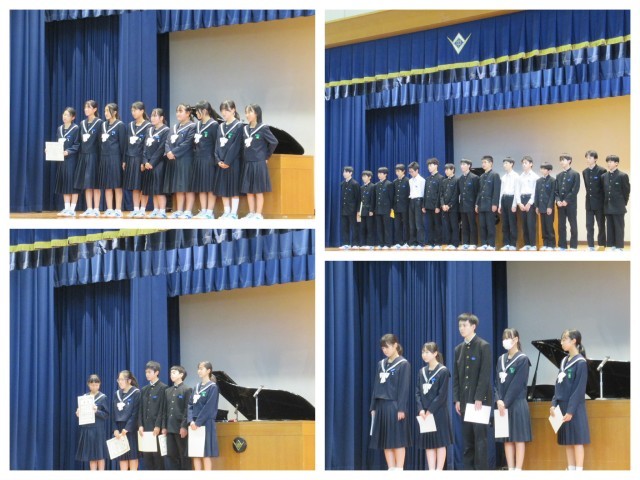 表彰伝達では、ソフトボール部、男子バレーボール部、陸上部、美術部、英語関係での紹介がありました。