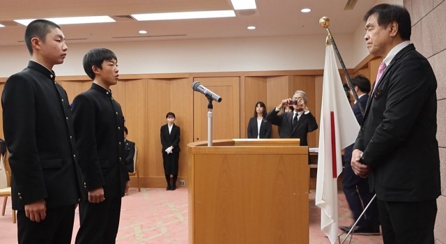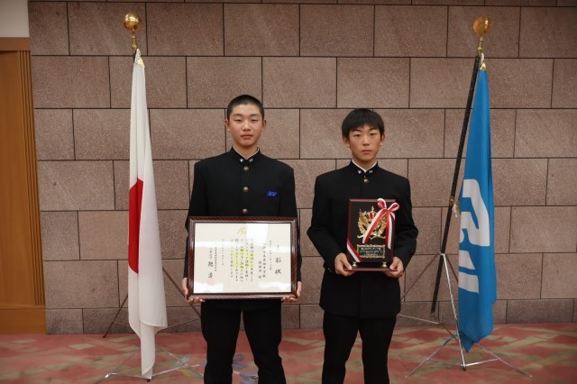 本校の野球部が受賞し、代表生徒が馳知事より賞状と盾をいただきました。