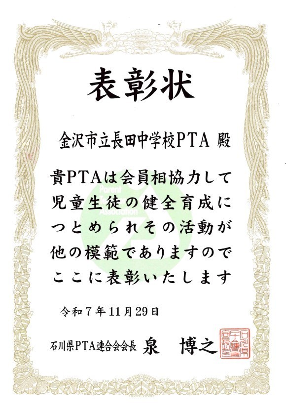 令和7年12月4日(木) 公開日 2025/12/04 更新日 2025/12/04 学校日記 本校のPTA活動について、県PTA連合会より表彰を受けました。保護者の皆様のご協力やご支援で、生徒たちが健やかに成長います。今後ともよろしくお願いします。