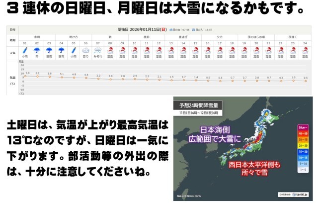 令和8年1月9日(金) 公開日 2026/01/09 更新日 2026/01/09 学校日記 天気予報を見ると、3連休は寒暖差が激しくなり、日曜日から大雪の予想がでています。ちょうど成人式になりますので、新成人の方々は会場まで道中は要注意です。本校も、部活動の冬期の大会の会場校になっていますが、送迎の保護者・顧問等の皆様におかれましては、運転に十分注意をなさってください。