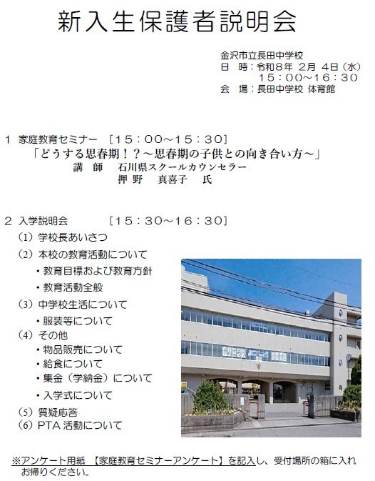本日は、次年度の新入生を迎えるにあたり、保護者の方々への説明会を開催します。どうかよろしくお願いします。