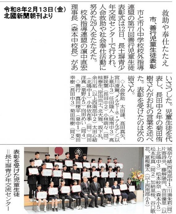 令和8年2月13日(金) 公開日 2026/02/13 更新日 2026/02/13 学校日記 12日に金沢市善行児童生徒表彰が行われました。本校からは人命救助部門、善行部門の2つともに選ばれています。困っている人を助ける行為、日頃の活動が評価されました。おめでとう!