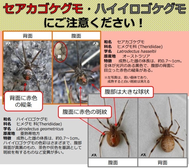 特定外来生物セアカゴケグモ一匹が確認されたというお知らせが届きましたので、以下のHPを参考にしてください。