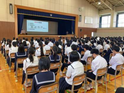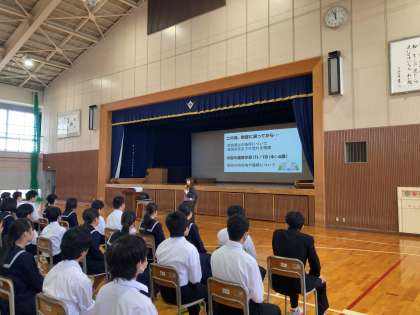 2年生は、30日(木)4限目に進路に関する学習会を行いました。2年生にとって、中学校生活はいよいよ折り返しです。来年度に控えた進路選択について、これから取り組んでいきます。本間先生や八尾先生の話を真剣に聴き入る2年生の姿にまた1つ成長を感じました。学年集会で使用したスライドは、学校HPトップの「進路関係資料」に掲載しています。