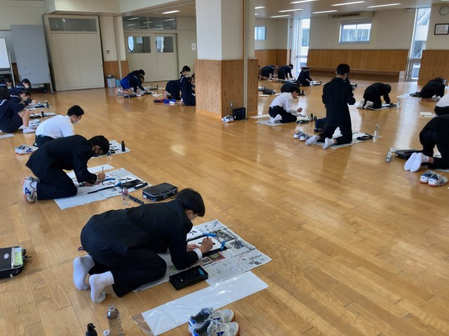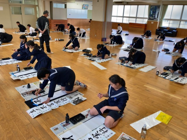 ふれあい広場で、書き初めの練習! 公開日 2024/12/23 更新日 2024/12/23 学校日記 1年生は書写の授業で、書き初めの練習です。ふれあい広場は暖房が入り、用紙を広げて書くことができるので練習には最適!今年の1年生のお題目は「不言実行」!