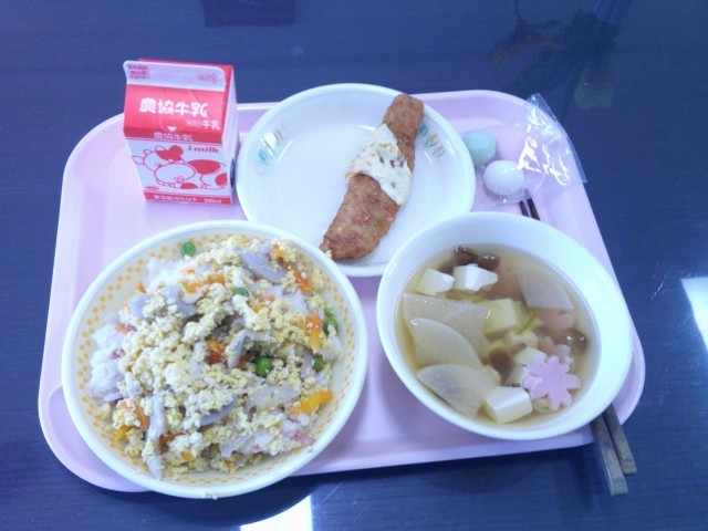 今日の給食は、かますフライ豆乳ソース、花見ずし、すまし汁、デザートは花見団子でした。美味しく頂きました。愛情たっぷり、優しさたっぷりの給食に感謝です。