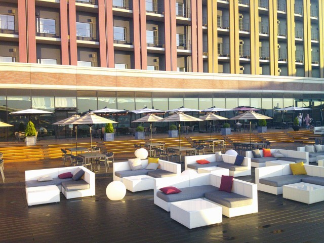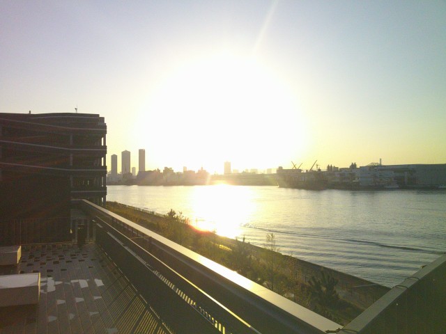 太陽の光がホテルを包み始めました。みなさんも起き始めたようです。天保山大橋も車音で賑やかです。ワクワクする朝です。