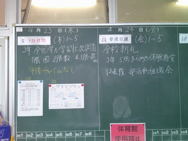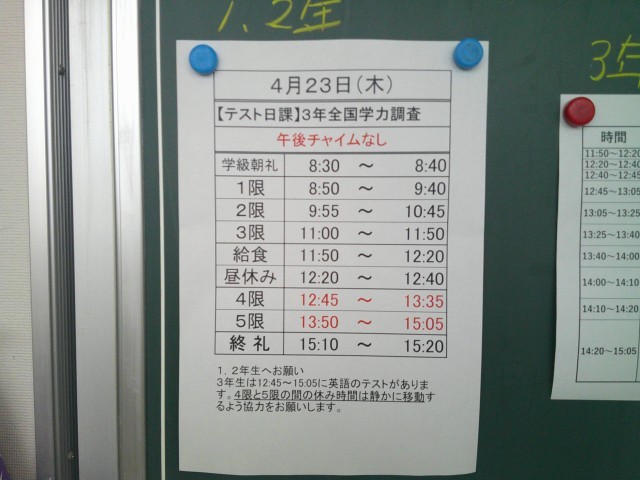 本日は、3年生の全国学力・学習状況調査が行われますので、テスト日課ですが、英語の調査が一人一台端末で行われるので、変則的な日程になっています。1年生・2年生は、休み時間教室移動の際に、3年生が調査を実施ている状況があることを心に留めて休み時間を過ごしてほしいと思います。ご協力お願いします。