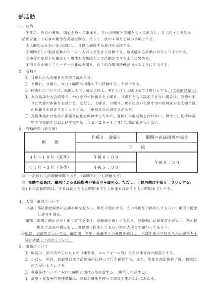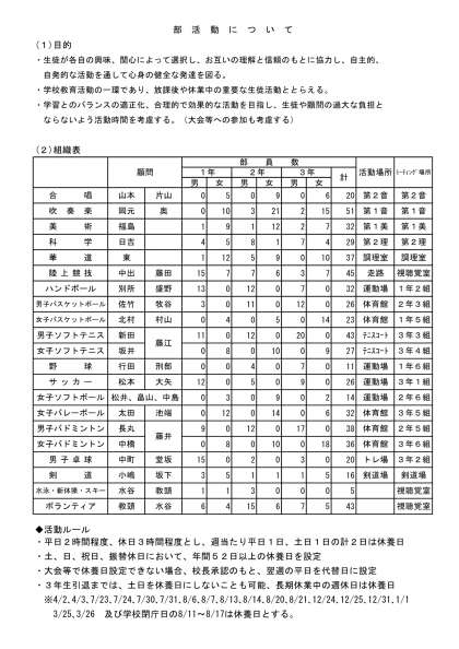 令和4年度の部活動について 公開日 2022/06/03 更新日 2022/06/03 部活動 今年度の部活動の目的や活動時間及び5/1現在の人数をお知らせします。なお、詳しいことや活動の詳細については部活動毎に違うこともありますので顧問にご確認ください。