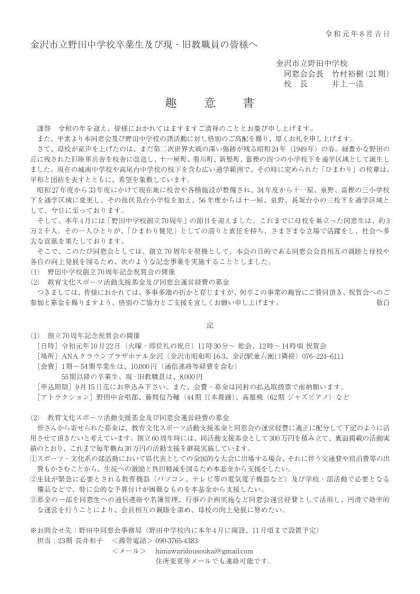 令和元年10月22日(火・即位礼の祝日)、11時30分から総会、12時から14時頃祝賀会が開催されます。場所は、ANAクラウンプラザホテル金沢(金沢駅兼六園口隣接)です。会費は、1期から54期の卒業生は1万円、55期以降の卒業生ならびに教職員は8千円です。