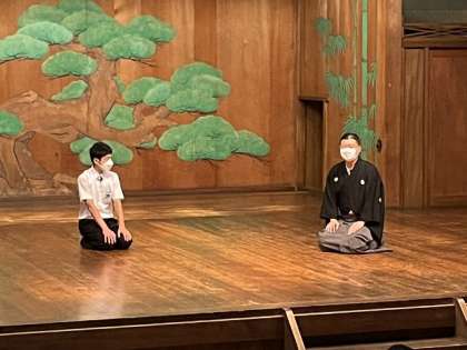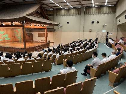 3年生が能を鑑賞しました 公開日 2022/07/12 更新日 2022/07/12 学校の様子 金沢市の中学3年生が能や狂言を鑑賞する”観能教室”が12日にありました。この教室は、今年で73回目であり、金沢能楽会の会員が能と狂言を披露しています。今回は、能「羽衣」と狂言「附子(ぶす)」が演じられました。 野田中は、村山市長や野口教育長と一緒に鑑賞することとなり、テレビ取材も入っていたそうです。
