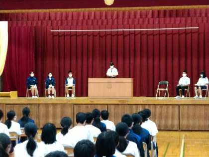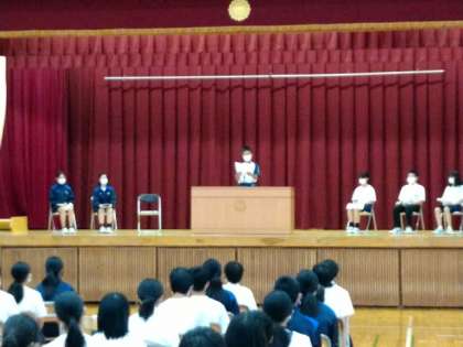1年生 メッセージ作文発表会 公開日 2022/07/14 更新日 2022/07/14 学校の様子 本日、1年生のメッセージ発表会がありました。各クラスから代表者がでて体育館のステージを自信をもって発表していました。自分の考えを言えることはとても立派ですね。