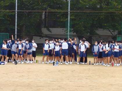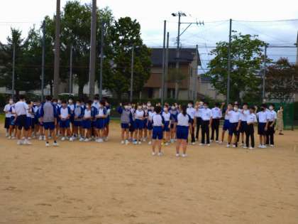 今日の5限目は、全学年合同での応援練習でした。曇り空でしたが運動場で練習しました。少しずつ確実に、そろってきています。当日を楽しみにしておいてください。写真は、左から青団、赤団、黄団です。