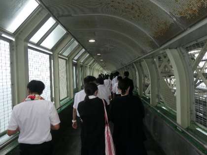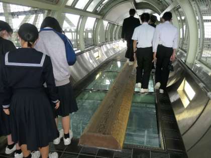 修学旅行2日目(クラス別行動 その4) 公開日 2022/09/27 更新日 2022/09/27 学校の様子 今日の最後は、舞子プロムナードと橋の科学館です。あいにくの雨にあいまして、移動は傘が必要でした。しかし、エレベータで上に上がると、その高さに足がすくみます。アクリル板の上を通るときは、海が見えるのです。その後、この橋の建築当時を知る科学館を見学しました。