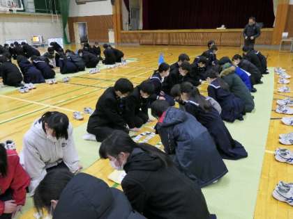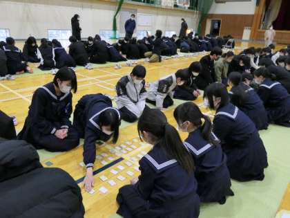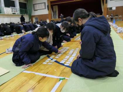 1年生「百人一首」大会について 公開日 2023/02/08 更新日 2023/02/08 学校の様子 先日の2年生に続き、今日は1年生のクラス対抗「百人一首大会」を行いました。各クラスで4人グループを作り競いあいました。結果は、1位5組、2位4組、3位1組でしたがどのクラスも楽しそうで一所懸命に行っていました。 日本古来の伝統的な遊びはとてもいいもので、1年生も満喫できとここと思います。