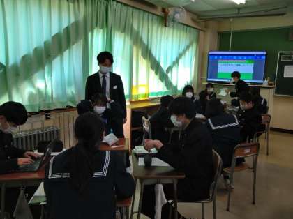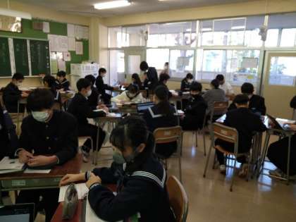 道徳の授業は週1回実施されています。いつもは学級担任が行っていますが、今日は級外の教員が行いました。題材は「緑のじゅうたん」で「理想に近づけるために」を考える時間でした。冬の国立競技場の芝生を緑に変えた方のお話でした。生徒たちは、クロムブックで自分の思いを応えたり、班での話し合いの内容を応えたりしていました。いつもと変わらない光景でした。道徳の授業を通じて、自分自身の生き方を考えてほしいと思います。