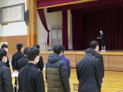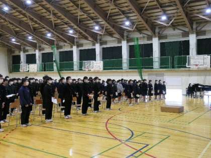 今日は3月1日、3年生の卒業式の歌練習で初めて全員での練習がありました。これまでは、音楽の授業で各クラスごとでしたが、200人が揃っての練習でした。これまでに歌ったことのない歌ですので、少し心配でしたが、とても良かったです。あと10日間の学校生活で、高校受検、卒業式と3年間の集大成を迎えますが、一人一人が大きく成長してくれたことを喜んでいる毎日です。