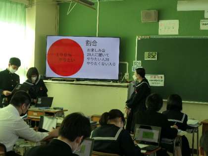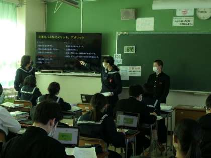 2年生国語科の勉強で、グループで調べることを決めて、それをプレゼンを使って発表を行う時間がありました。時間の関係で2つほどしか見ることができませんでしたが、太陽光発電の利用促進など、生徒が調査したりしてそれをまとめたものでした。自分の意見を持って発表することは、これからの勉強に役立ちますので、頑張りましょう。