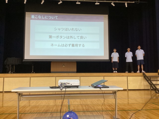 12/1(月)、全校集会にて、生徒会役員の皆さんより、来年度からの夏服についての発表がありました。