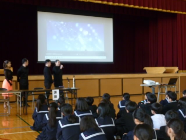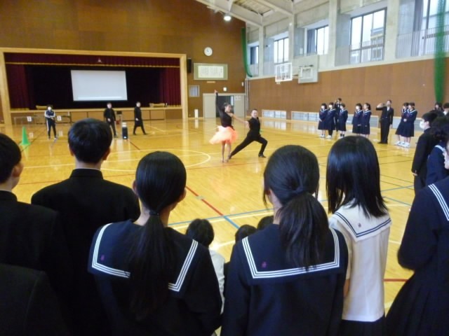 本日2限目、1年生を対象に金沢ボールルームダンス連盟の方によるダンス体験事業が行われました。1年生がホンモノに触れる体験でしたが、迫力に驚いた様子でした。また、生徒も少し体験をさせていただきましたが、楽しそうに取り組んでいたのが印象的でした。なかなかできないホンモノに触れる体験、貴重な時間となりました。ありがとうございました。