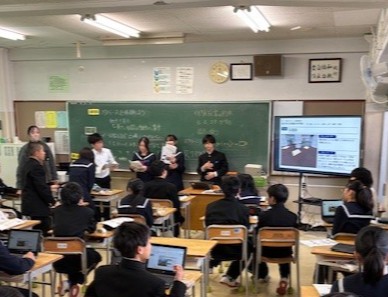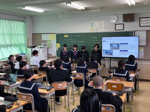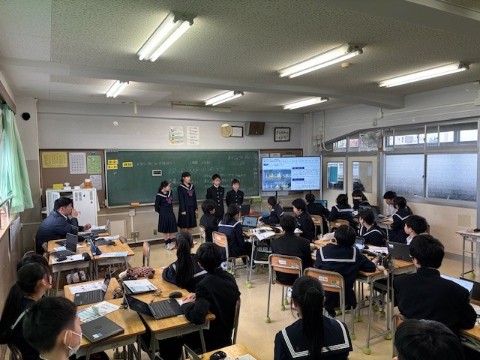 本日、1年生を対象にメタバース体験事業が行われました。今年度より総合的な学習の時間においてデジタル科として先端技術体験を行っております。1年生には「金沢メタバース体験学習」として、先端技術に触れることと、金沢の地域作りに活用することを目的としています。本日はNTTドコモビジネスより3名、ベネッセコーポレーションより3名のゲストティーチャーをお招きして、メタバース空間に入り、課題に対してグループで取り組んだことを発表しました。中学生らしいアイデアを、オブジェクトを使ってメタバース空間で表現していて、しっかり考えている様子が見られました。