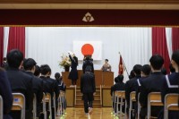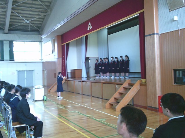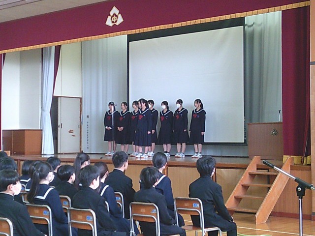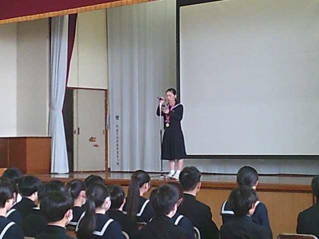 全校集会では、稗田さんの表彰披露、そして硬式テニス部の全国大会に向けての激励会を実施しました。