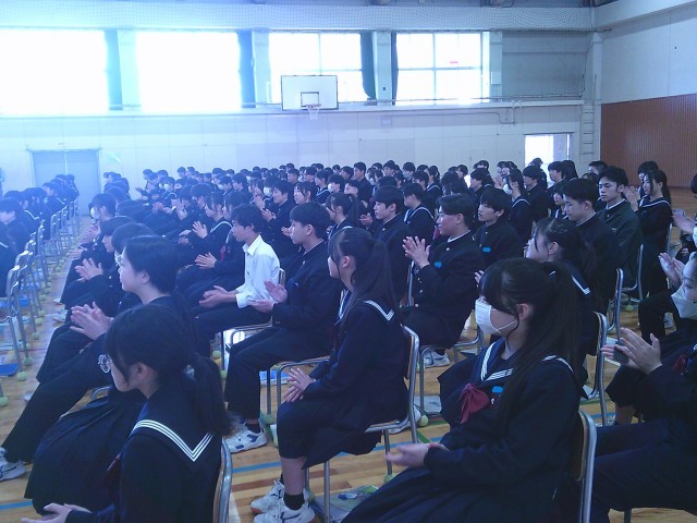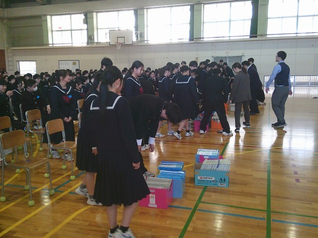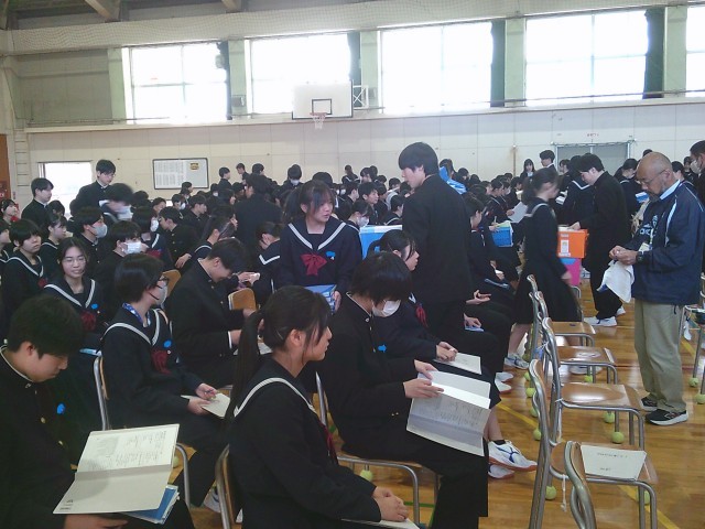 2年生の時に使用していたものを分配する作業をした後、学年集会を行いました。3年所属の先生方からのメッセージを覚えていますか。「一緒に1年間学校生活を送れることになって嬉しい」という言葉から、みなさんへの熱い思いが伝わってきました。「受験は任せて」という力強い言葉もありました。誰にとっても充実した1年になるように、みんなで力を合わせていきましょう。