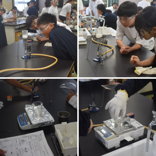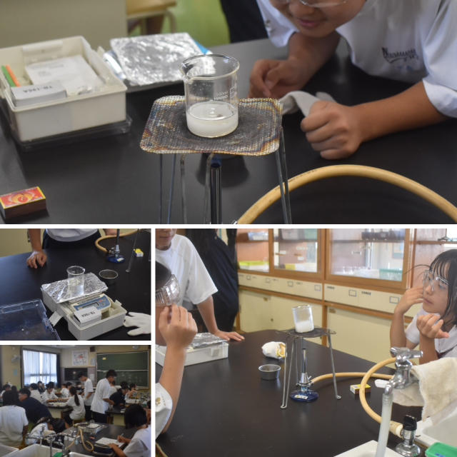 1年生理科の授業。今日の課題は「ロウを個体→液体にすると質量や体積はどうなるのか?」。質量、体積、それぞれの変化を予想し実験に取り組んでいました。その後、結果を記録し、固体→液体→気体をモデルでどう表すか考えました。ロウの変化を興味津々に眺めている様子が素敵であると同時に、結果に素直に驚いたり、反応したりする好奇心をいつまでも持ち続けてくださいね。
