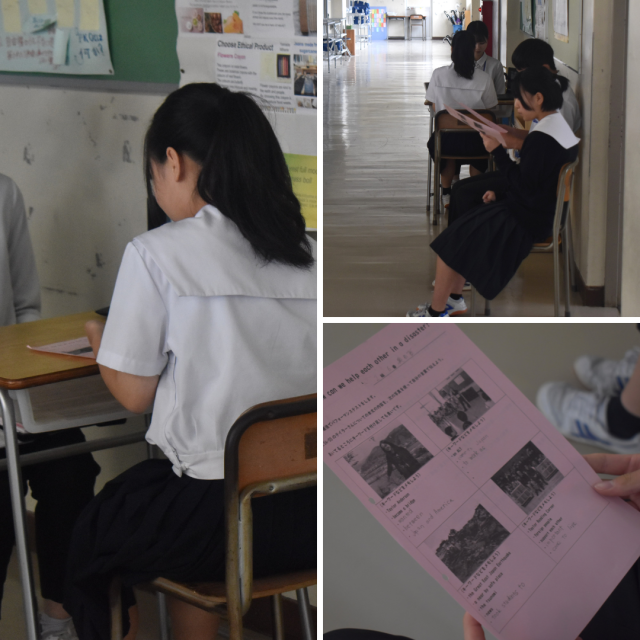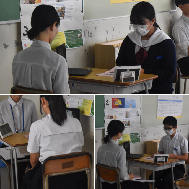 3年生英語科の授業。パフォーマンステストを行っていました。学習した本文内容について、キーワードを手がかりにしながら、自分の言葉で伝えていました。ある程度まとまりのある英文を要約して適切に伝える力が評価されますね。何名かの様子を拝見しましたが、どの人もしっかりと伝えることができていて感心しました。