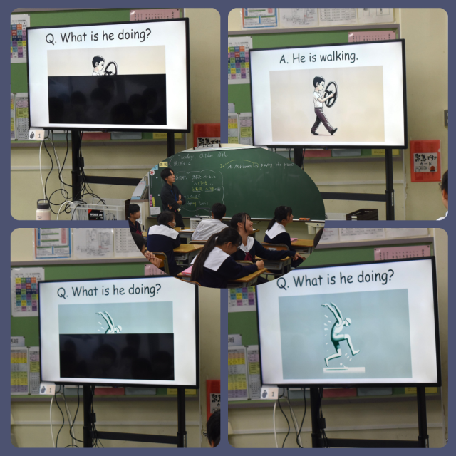 1年生英語科の授業。モニターには、何か動作をしている絵が提示されていますが、半分隠れています(写真参照)。先生が生徒達に尋ねます、 "What is he doing?". 生徒達は何をしているか想像し、互いの答えを周りの人たちに伝えています。