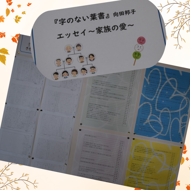 2年生のフロアに、向田邦子さん作の『字のない葉書』での学びを生かして、生徒の皆さんが書いた「エッセイ~家族への愛」のいくつかが展示されています。2作品だけですが紹介します。