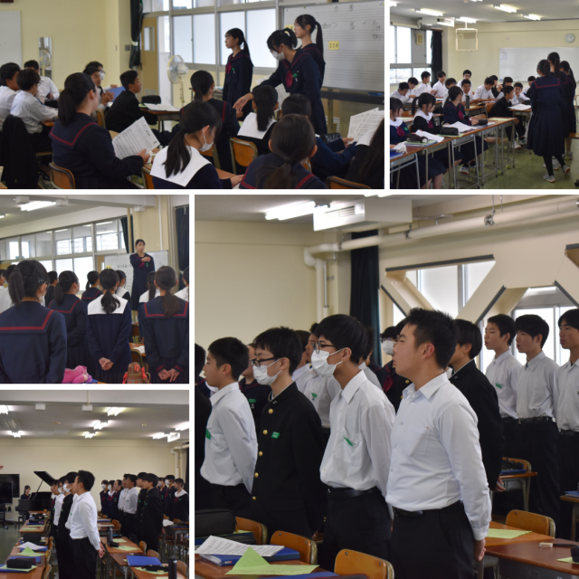 2年生音楽科の授業。1回目の全体合唱後、責任者、指揮者、伴奏者を中心に改善点を全体で確認し、2回目の全体合唱へ。ここでも、目指すべき目標に向けて、一歩ずつ階段を上っているクラスの姿がありました。