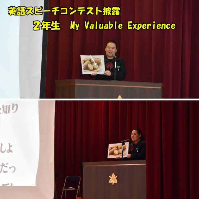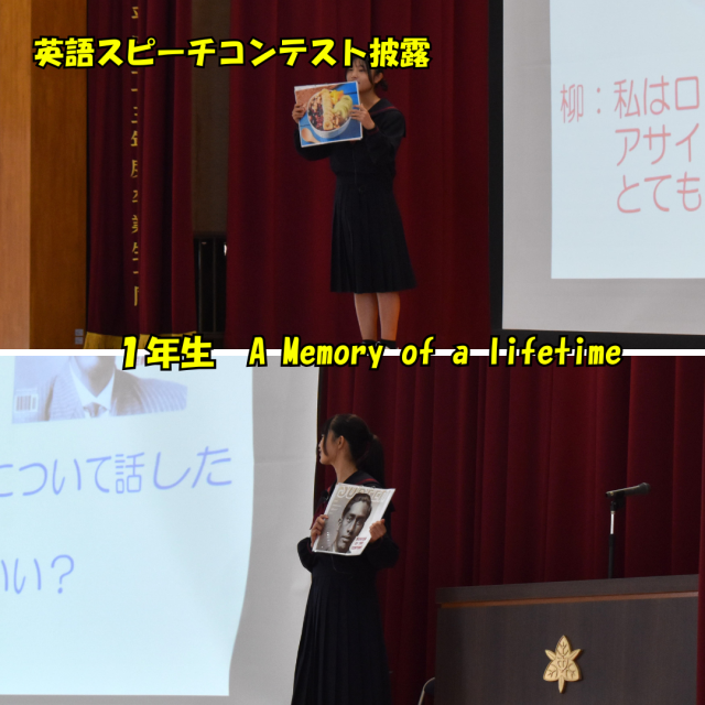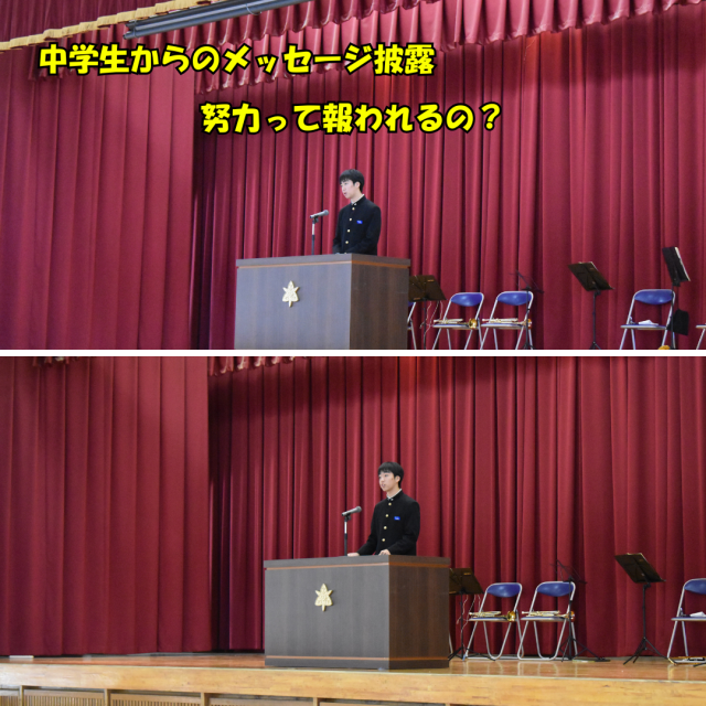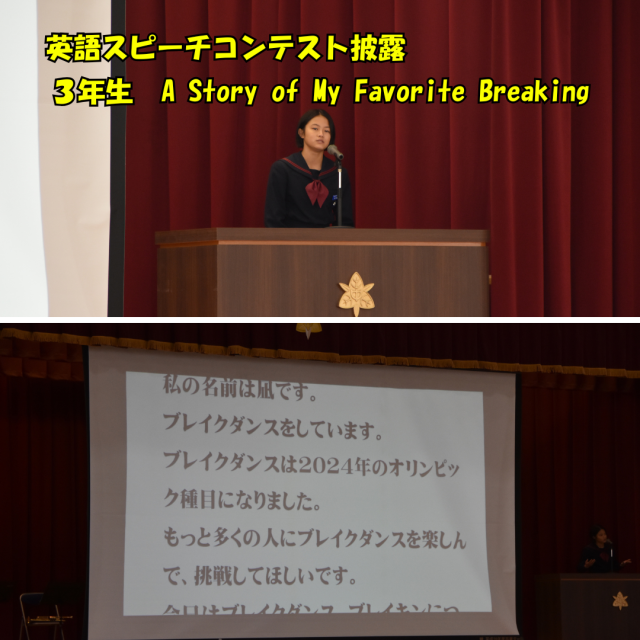 文化祭第一部「文化発表会」②! 公開日 2025/11/04 更新日 2025/11/04 学校の様子 11月4日(火)各学年の総合的な学習の時間の発表に続き、「金沢市中学校英語スピーチコンテスト」及び「金沢市中学生からのメッセージ大会」出場者の発表がありました。どのパフォーマンスも堂々としていて、しっかりと観衆にメッセージが届きました。 +1