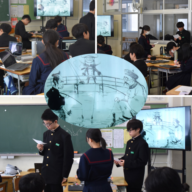 2年生社会科の授業。授業の様子を少し拝見しに教室に入ると、モニターには、私も見覚えのある「風刺画」が映し出されていました。日本を含めた各国の思惑を表現した風刺画から、この当時の時代背景に迫っていました。当時の日本はどのような思惑を持って進もうとしていたのでしょうか?