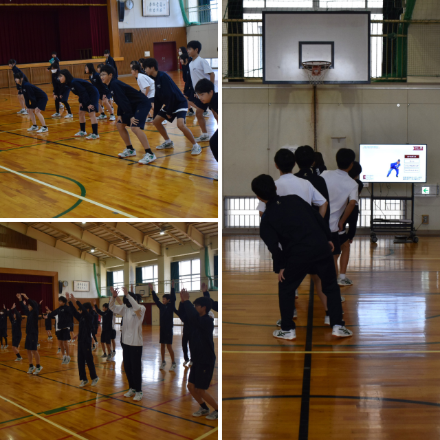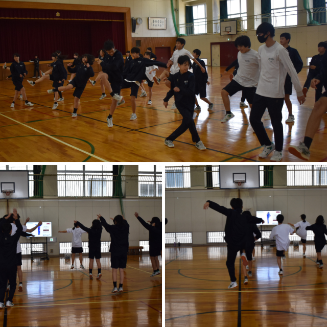 2年生保健体育科の授業。ダンスに取り組んでいました。今日は、choo choo TRAIN の振り付け動画に合わせて、基本の動きを全員で確認していました。何回か繰り返すうちに、みんなの気持ちも乗ってきて動きもよくなりました。