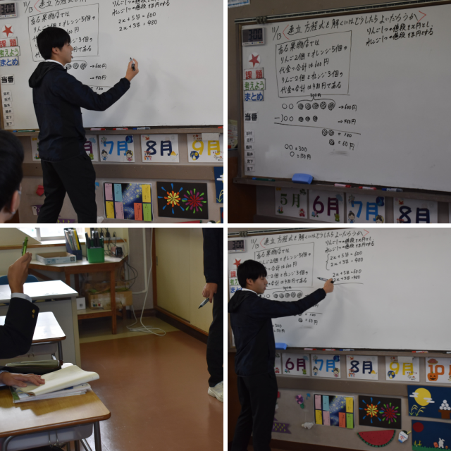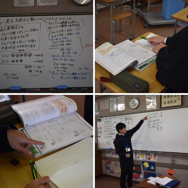 かがやき学級2年生数学科の授業。今日の課題は「連立方程式を解くにはどうすればよいか」。黒板に示された例題を、まずは図を用いて解答。次に方程式で表し、同じく解を導き出しました。練習問題を通して確認、次は係数が違う連立方程式の解法へと続きました。先生とのやりとりを通して、スモールステップで解法のポイントを理解しながら学びが深まっていく様子がはっきりとわかりました。いつも素敵な学びの姿です。