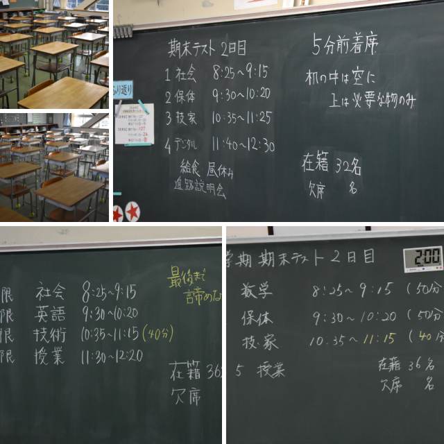 本日は期末テスト第2日。各学年残り3教科のテストが実施されます。生徒の皆さん、時間いっぱい問題と向き合い、それぞれのベストを尽くしてください。負けるな、鳴和中生!