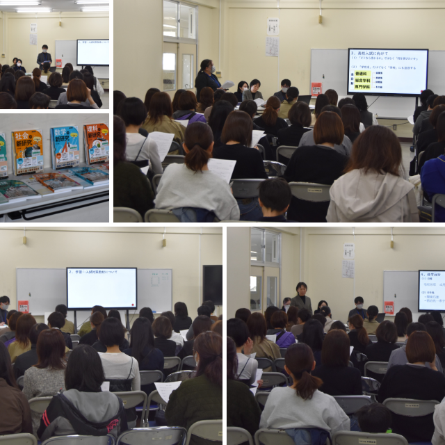 2年生の学校生活の様子、入試対策教材、高校入試、修学旅行等について、各担当から話をさせていただきました。3年生からのバトンを引き継ぎ、中堅学年から最高学年へと着実に歩みを進めている2年生の皆さんをこれからも応援します。