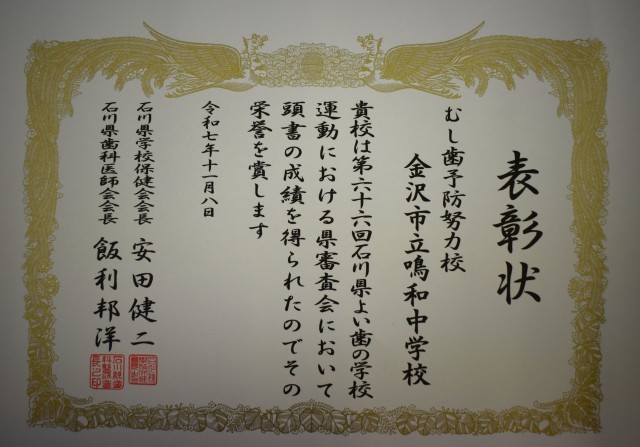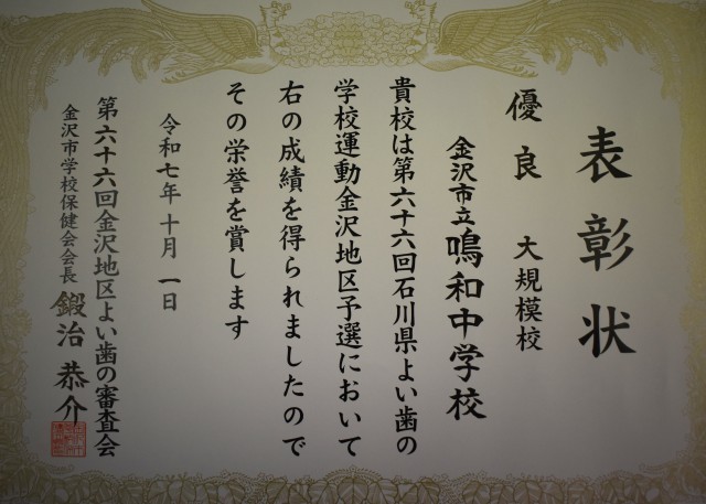 さて本校が、第六十六回石川県よい歯の学校運動における県審査会において「むし歯予防努力校」、第六十六回石川県よい歯の学校運動金沢地区予選において「優良(大規模校)」を受けました。