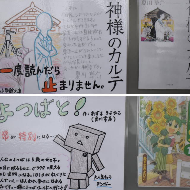 ががやき学級教室前に、国語科の授業で作成した「おすすめの本」紹介が掲示されています。どれも学習したことが生かされていて、読んでみたくなるような工夫がたくさんつまった素敵な作品となっています。