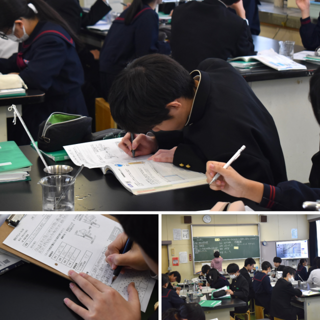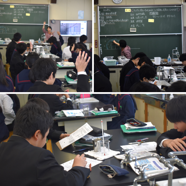 2年生理科の授業。冷たい飲み物をガラスなどのコップに入れておくとつく水滴、よく見かける光景です。あの水滴は一体どこから来たものなのでしょうか?今日は、実験結果や既習をもとに、水滴の謎について考えていました。飽和水蒸気量(1㎥中に含まれる限界の水蒸気量)は、温度が低下するほど含める水蒸気量は減るという性質から、冷たいコップの周りでは飽和水蒸気量が低下して、含みきれなくなった水蒸気が水滴として出てくる、という考察にしっかりとたどり着きました。