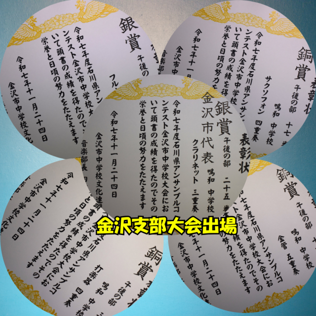 先週24日(月祝)に、石川県アンサンブルコンテスト金沢市中学校大会が、金沢龍谷高校講堂を会場に開催されました。本校吹奏楽部は、打楽器4重奏、金管5重奏、サクソフォン4重奏、クラリネット3重奏、フルート3重奏に出場しました。審査会という緊張感ある中でしたが、出場した皆さんは精一杯のパフォーマンスを見せてくれました。大変お疲れ様でした。