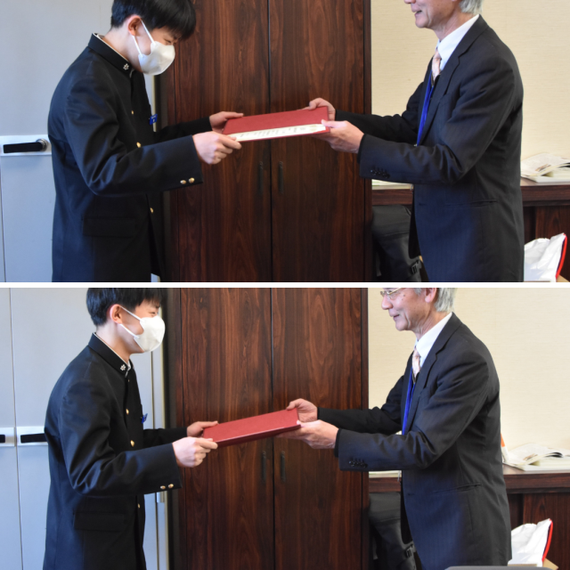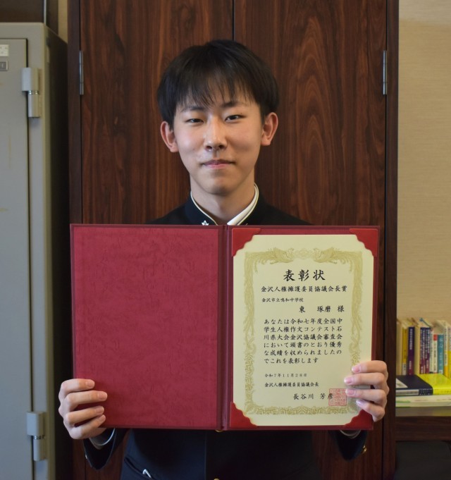 うれしい知らせが届きました。本校3年の東琢磨さんが、応募した中学生人権作文コンテストにおいて、「金沢人権擁護委員協議会長賞」を受賞しました。おめでとうございます。一昨日16日(火)、金沢人権擁護委員協議会の方が来校され賞状を届けてくださいました。本日、東さん本人に賞状と景品を手渡しました。彼は「小さな力」というテーマで作文を書きました。